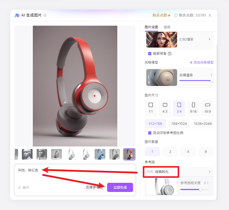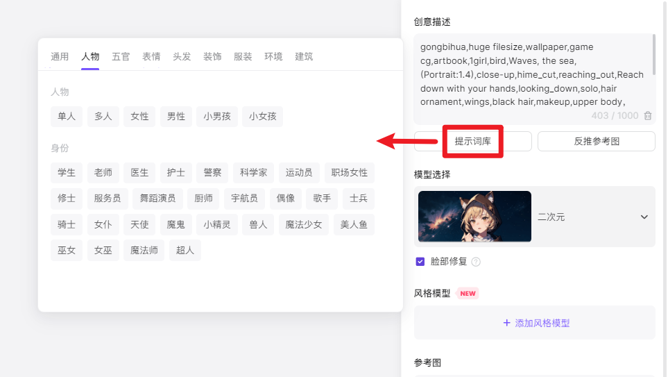 下图左侧是Pixso AI绘画功能内置的多款气概模子,同时将参考体例更改为「线稿」,能够点击「创意描述」底部的「提醒词库」,
